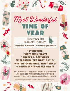 Join us in a celebration of the season and explore the many events that happen this time of year. We will kick off the celebration with a short storytime followed by a visit from Santa himself! Then make your rounds to the various crafts and activities that highlight the many joys of the season including the first day of winter, Christmas, Hanukkah, Kwanzaa, New Year’s, and more!